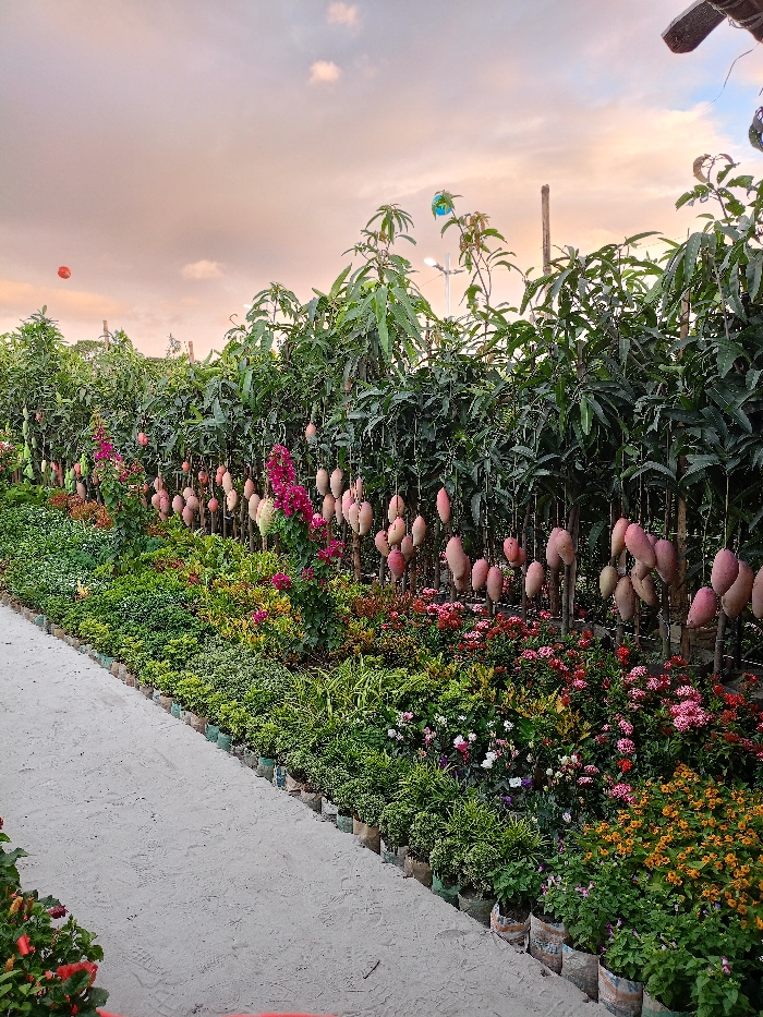 A vibrant garden scene unfolds under a pink-tinged sky. Mango trees line the top, their branches heavy with ripe fruit suspended by strings. Below, a colorful array of flowers and greenery fills the garden beds, separated by a light gray pathway. The flowers display hues of red, pink, white, and yellow. The plants are contained in burlap bags, adding a rustic charm to the lush environment.