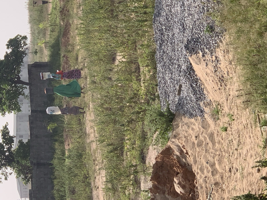 The image captures an outdoor scene in Karsana 2, Nigeria, under bright daylight. In the foreground, a prominent mound of light brown sand is visible on the left, next to a large pile of grey crushed gravel on the right. A single reddish-brown brick rests on the gravel pile. The mid-ground features a dirt path cutting through sparse green vegetation. Three individuals are walking in a single file line from left to right along this path. The leftmost individual carries a translucent white plastic container, possibly a water bottle, on her head. The middle individual, dressed in a green robe, balances a dark bucket on her head. The rightmost individual, wearing a red top and patterned skirt, carries a stack of light-colored containers or bowls on her head. In the background, a dark stone wall extends horizontally, behind which several light-colored, multi-story buildings and trees are visible. A fourth, more distant figure, carrying an object, is partially visible on the far right, moving away from the central figures.