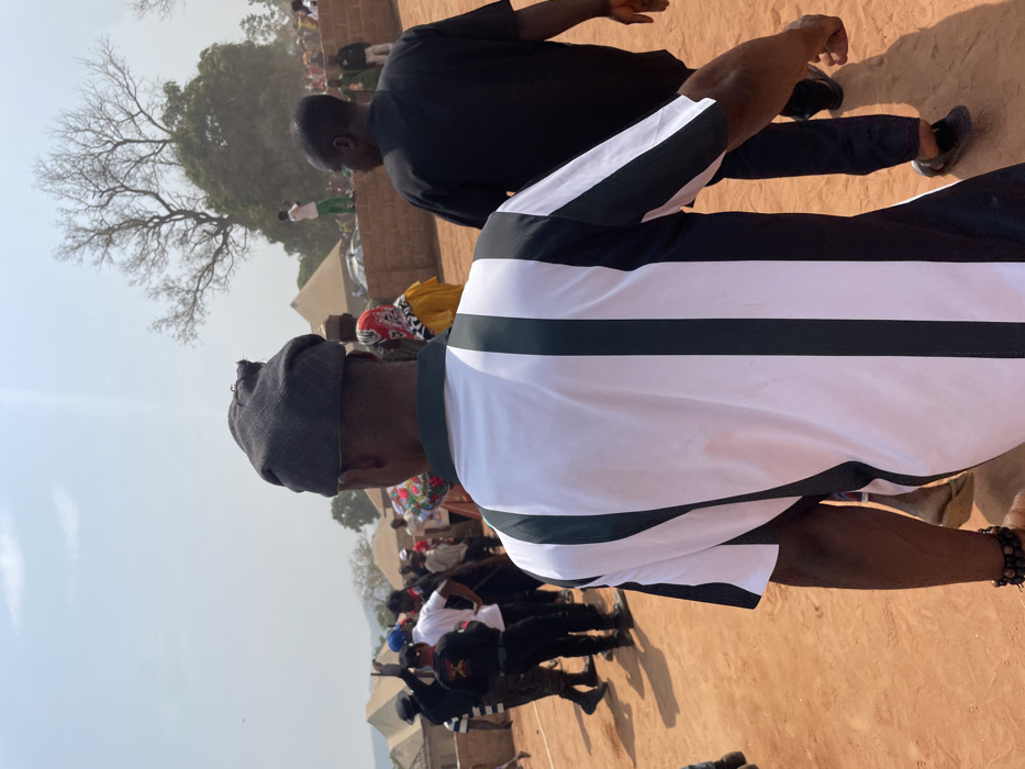 A crowd gathers outdoors on a reddish-brown surface. Several individuals are visible, including one wearing a black and white striped garment and a dark hat. Another person in a black outfit walks nearby. A bare tree is visible in the background. Tents and other structures are present in the distance, suggesting an event or gathering. The sky is light blue.