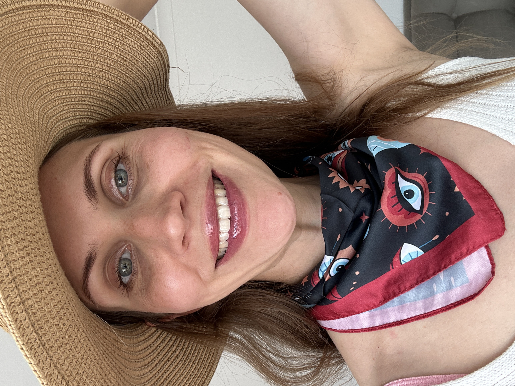 A young woman, facing the camera at an angle, is smiling broadly with visible teeth. She is wearing a tan woven sun hat and a black silk scarf with a red border, decorated with eye-like designs, around her neck. She appears to be indoors. The location in the city of Fethiye, Turkey, cannot be determined from the visual information provided.
