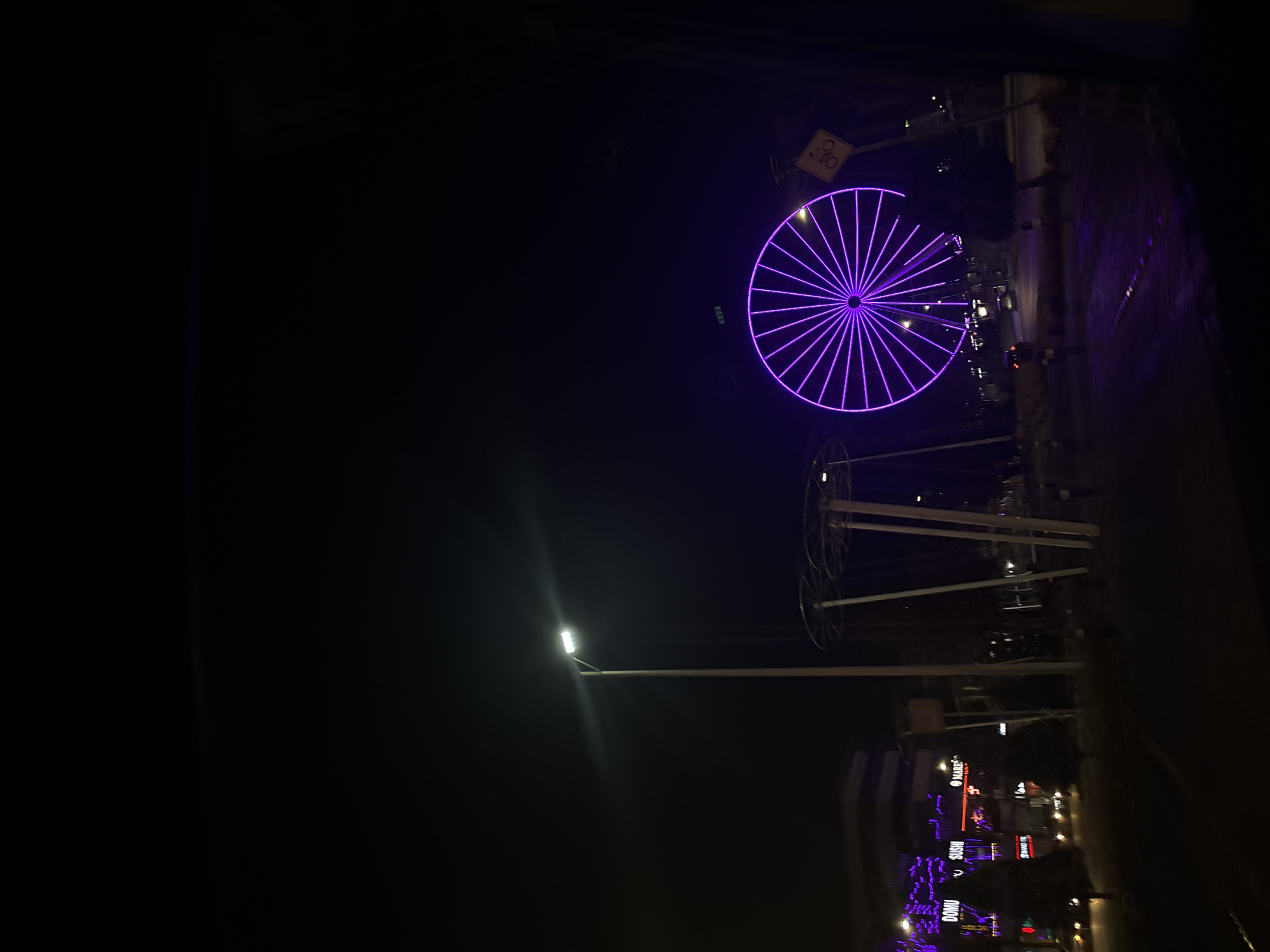 At night, a Ferris wheel in Puebla, Mexico is illuminated in purple. A street lamp shines on the scene. Restaurants and businesses are lined up on a street.