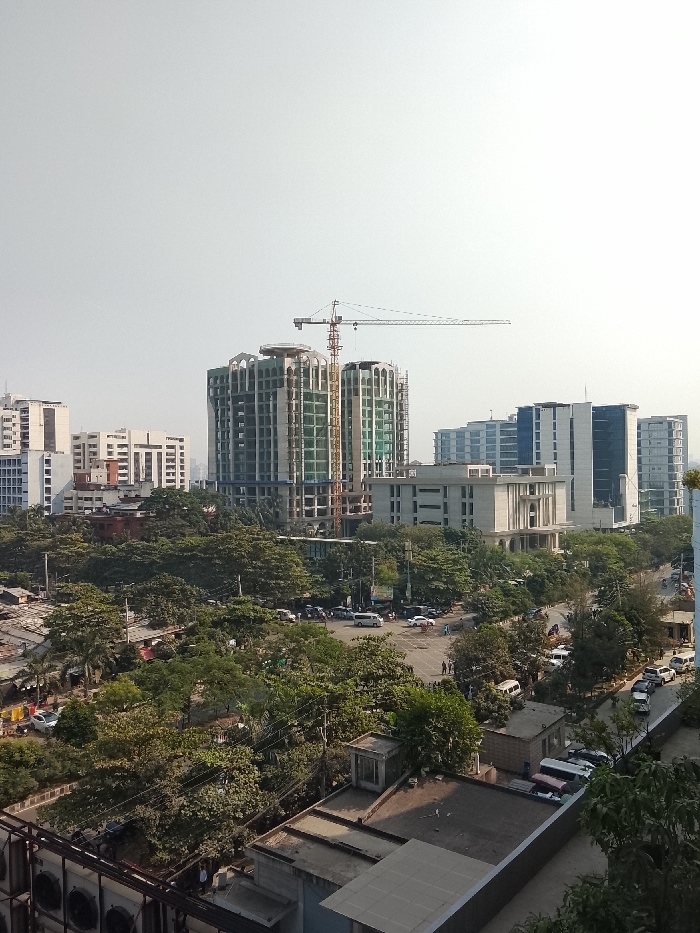 A cityscape with a mix of old and modern buildings, trees, and streets. Prominent features include two tall, unfinished circular buildings with a crane in between, and several modern glass-faced office buildings. A low-rise building with prominent arches is visible. The street is filled with parked cars and trees. The photo appears to have been taken from a high vantage point, with the sky a bright, cloudless white. The lighting is diffused.
