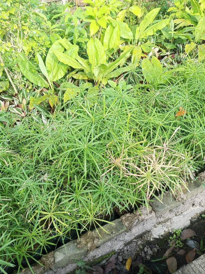 Lush greenery dominates the frame, showcasing various plants. In the foreground, clusters of slender, star-shaped leaves create a dense mat. Behind, broad, elongated leaves stand upright, contrasting with the finer foliage. A low concrete border separates the plants from a darker area with scattered leaves and debris. The overall scene conveys a sense of abundant plant life.