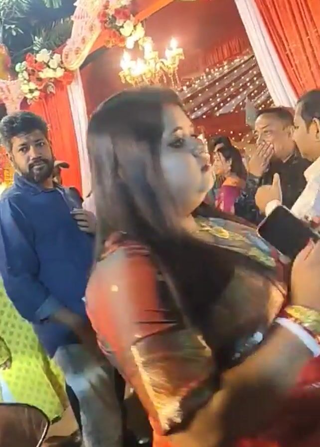 group of people at an event, likely a wedding reception, as indicated by the decorated archway in the background. The archway is adorned with red and white fabric, flowers, and a chandelier. The people are dressed in a variety of formal and semi-formal attire. A woman in a red and gold saree stands prominently in the foreground. A number of men are also visible, some wearing suits or blazers and others in more casual shirts. There is some chatter and music in the background. The camera moves around, showing different people and perspectives of the gathering.