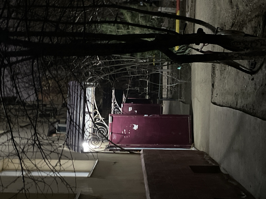 The image displays a dimly lit outdoor scene at night, depicting an urban alleyway or courtyard within Navoiy City, Uzbekistan