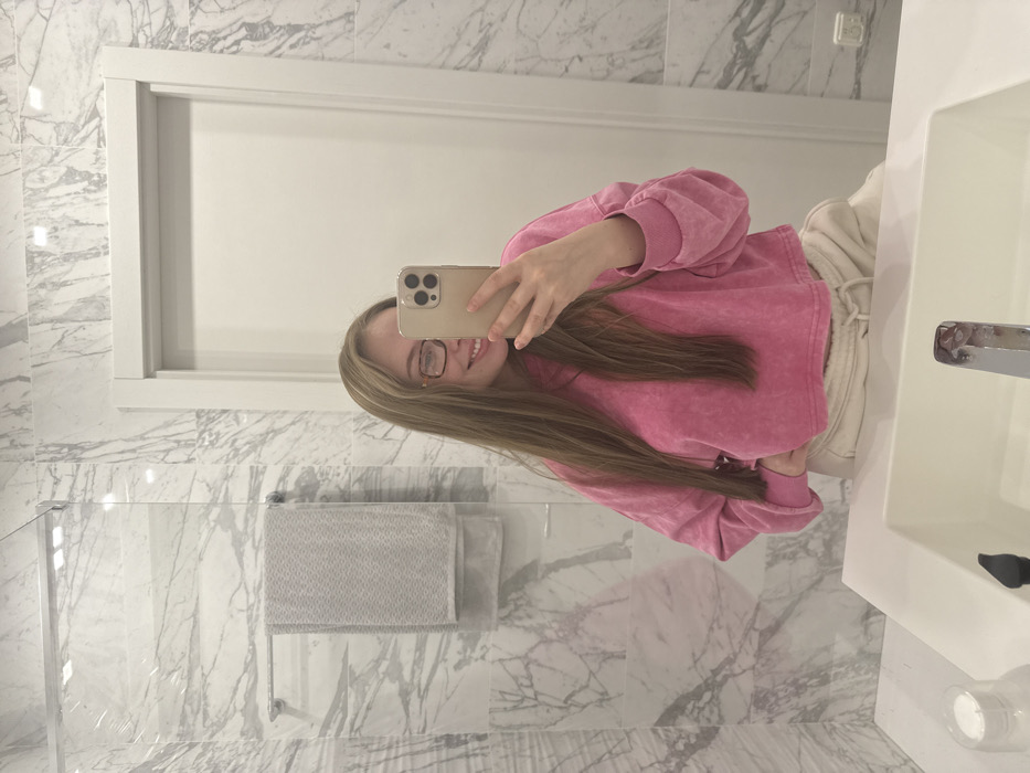 A young woman with long blonde hair and glasses takes a selfie in a bathroom with marble walls. She wears a pink, cropped sweatshirt and light-colored sweatpants. The background features a white door and a sink with a silver faucet. A gray towel hangs on the wall next to a glass shower door. The overall lighting appears bright.