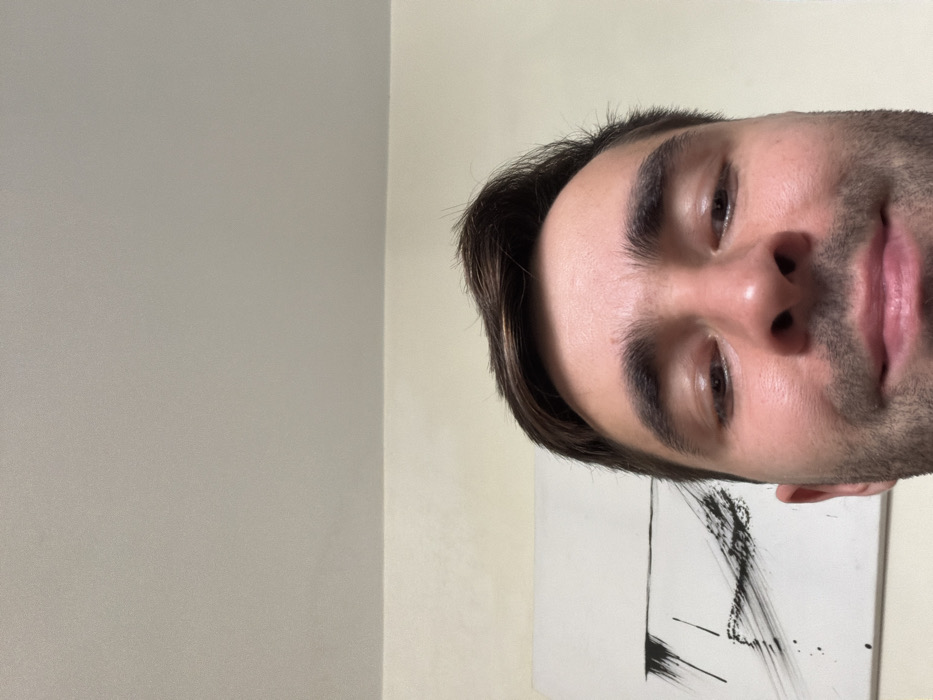 The image displays a close-up, low-angle indoor shot, focusing on a male subject. The subject's face is visible from the forehead to the upper chin, occupying the lower portion of the frame. He possesses short, dark brown hair, dark eyebrows, and a light-to-medium skin tone with visible stubble on his lower face. His eyes are directed slightly downwards, and a subtle smile is present on his lips. In the background, positioned to the subject's left, an abstract piece of art is mounted on a wall. This artwork features black, dynamic brushstrokes and splatters on a white surface. The wall itself is a light, possibly cream or light yellow, color, separated by a distinct horizontal line from a lighter-toned ceiling above. The subject appears to be posing for a photograph, likely a selfie, given the intimate and low-angle perspective. The environment is clearly an interior space. The specific location within the city of Amman, Jordan, cannot be determined from the visual evidence provided in the image.
