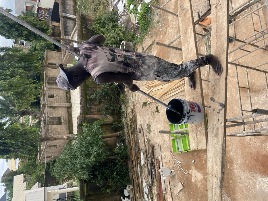 A male construction worker is depicted from a high angle, standing on wooden planks atop metal scaffolding at a construction site in Jos, Nigeria
