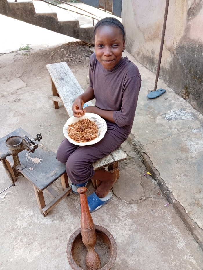 An outdoor scene in Sabon Tasha, Nigeria, depicts a young female individual seated on a weathered wooden bench. She wears a dark brown long-sleeved garment and blue and white slides. In her lap, she holds a white bowl containing numerous small, light brown, crispy food items, from which she is extracting pieces with her right hand. She smiles directly towards the camera. To her left, on a small wooden stool, a dark metal hand-crank grinding machine is positioned, with some powdered residue visible on the stool. In the foreground, a large wooden mortar holds a wooden pestle. The ground is an uneven, cracked concrete surface. In the background, a stained light-colored wall stands to the right, against which a metal pole leans, with a single dark slipper resting on the ground near its base. Concrete steps ascend in the upper-left background.