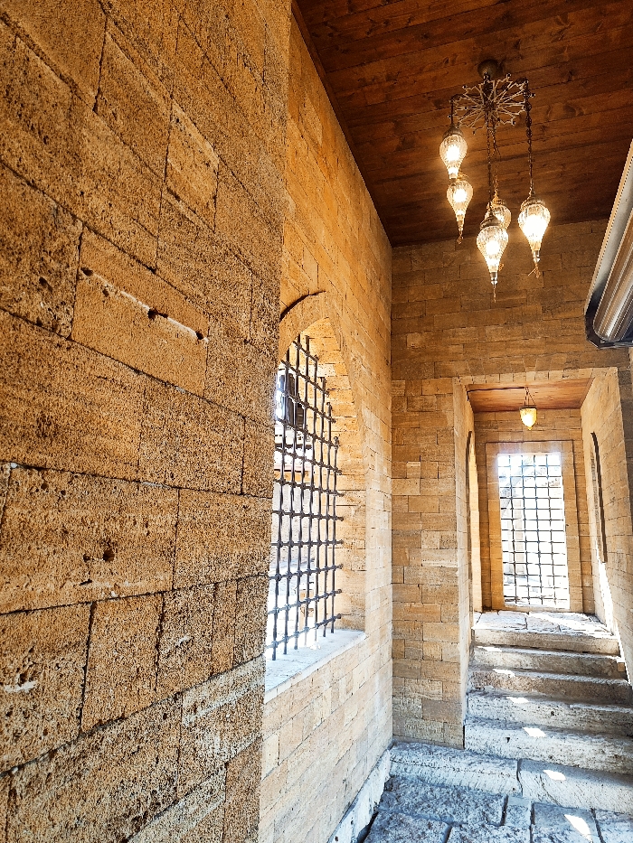 An interior view of the Juma-Jami Mosque (Khan's Mosque) in Yevpatoriya, Ukraine. The scene is dominated by walls constructed from rough-hewn, light brown sandstone blocks displaying visible pitting and irregularities. A dark brown wooden plank ceiling spans overhead. The floor consists of uneven, light grey stone paving. Natural light illuminates the space, entering through two distinct window openings, both secured with dark metal grids. One, an arched opening, is positioned on the left wall, extending into the midground. The second, a rectangular opening, is located at the end of a receding stone corridor, casting light onto a set of ascending stone steps. A prominent chandelier, featuring an ornate dark metal frame supporting five illuminated teardrop-shaped glass luminaires, hangs from the wooden ceiling in the foreground. A smaller, single luminaire of similar design is suspended further down the corridor. No individuals or active interactions are present.