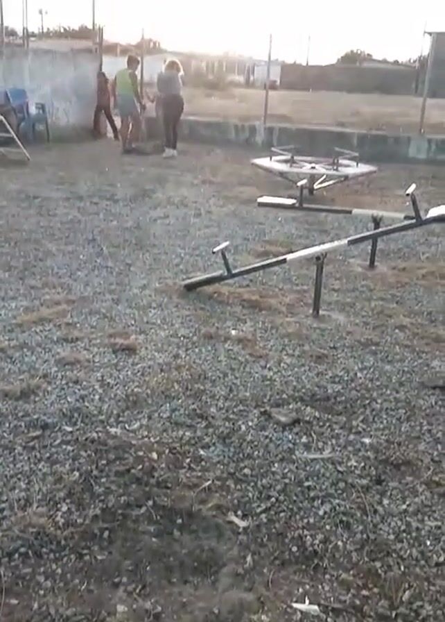 n outdoor playground at dusk. Several people, including children, are standing near a concrete structure in the background. The playground has a gravel surface, and some playground equipment, including a seesaw and a merry-go-round, are visible. The sky is cloudy with a partially visible sun peeking through. Power lines are strung across the top of the frame. A chain-link fence surrounds the playground area. People are walking and interacting, though their specific actions are unclear. The general environment is subdued due to the fading light.