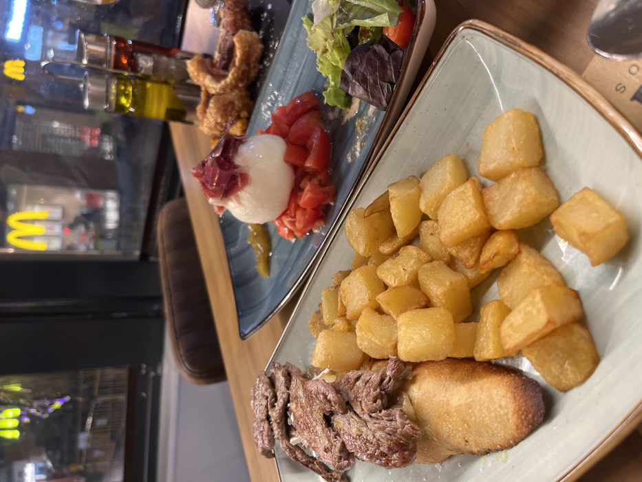 The image depicts an indoor dining setting at night, overlooking a street in Lloret de Mar, Spain, with the McDonald's restaurant at Avinguda de la Vila de Tossa, 51-53, 17310 Lloret de Mar, clearly visible through a large window in the background. In the foreground, two rectangular plates of food are positioned on a light-colored wooden table. The plate on the left features a slice of toasted bread topped with several pieces of cooked meat, accompanied by a generous portion of golden-brown diced fried potatoes. The plate on the right displays a burrata cheese ball resting on a bed of diced red tomatoes, garnished with thin slices of cured meat, and includes a dollop of green sauce, a small mixed green salad, and two pieces of fried items. Behind these food plates, two small glass cruets, one containing a yellow liquid (oil) and the other a reddish-brown liquid, are present. A dark brown upholstered chair or booth back is partially visible in the midground. No individuals are depicted within the frame.