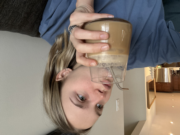 A person in a blue shirt holds a glass of iced coffee with a metal straw. They wear a detailed ring on one finger. The image is taken at an angle, with the person’s face visible. The background shows a room with hardwood floors, recessed lighting, and stainless steel appliances. A wooden frame hangs on the wall.