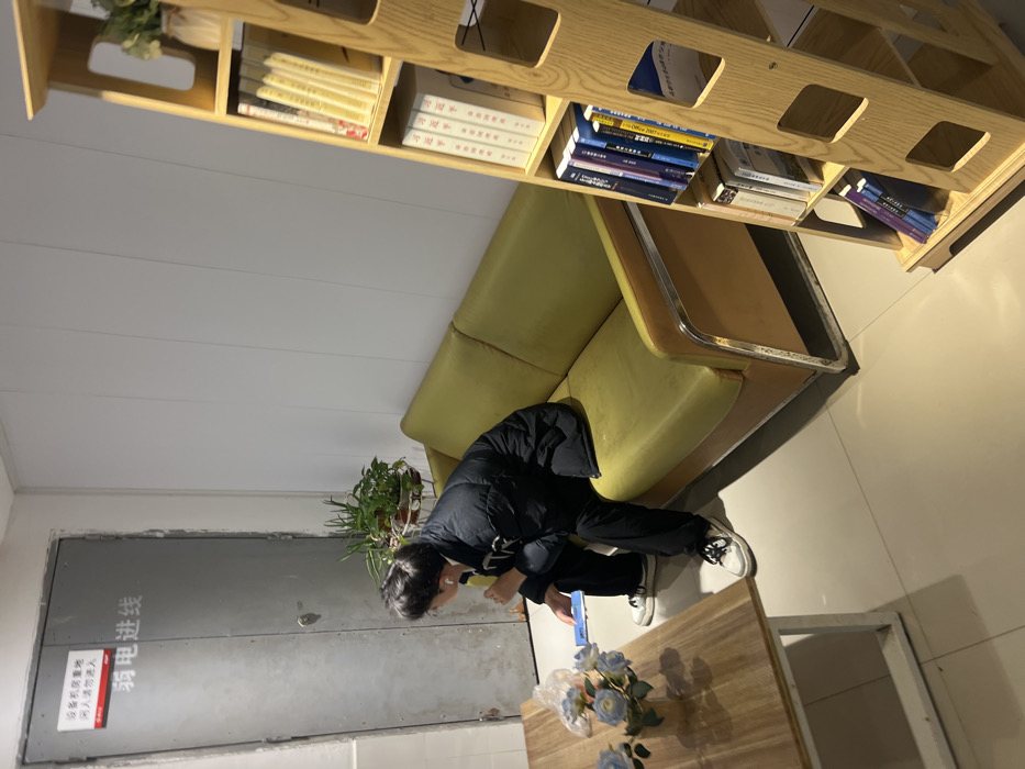 A person in a black jacket kneels on the floor, examining a blue object or device. They are positioned near a wooden coffee table with a bouquet of blue flowers. Behind them is a yellow and tan booth-style seating arrangement, topped by a bookshelf filled with books. To the left is a gray door with signage, adjacent to a potted plant. The background consists of a white wall and floor.