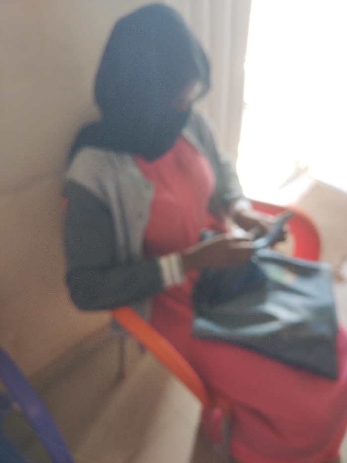 The image depicts an individual seated indoors in Fagge C, Nigeria. The person is wearing a dark head covering that obscures the face, a grey long-sleeved top or cardigan over a bright red or pink dress or tunic. A light-colored band is visible on the left wrist. The individual is seated on a chair with orange-colored frame components. To the left, a portion of another chair with purple components is visible. The person's hands are actively engaged with a small, dark object, possibly a mobile phone, held above a dark bag or folded fabric item resting on their lap. The background consists of a plain, light-colored wall. Strong natural light enters from the right side of the frame, indicative of a window, causing significant glare and overexposure in that area. The entire image is significantly out of focus, making precise detail identification difficult.