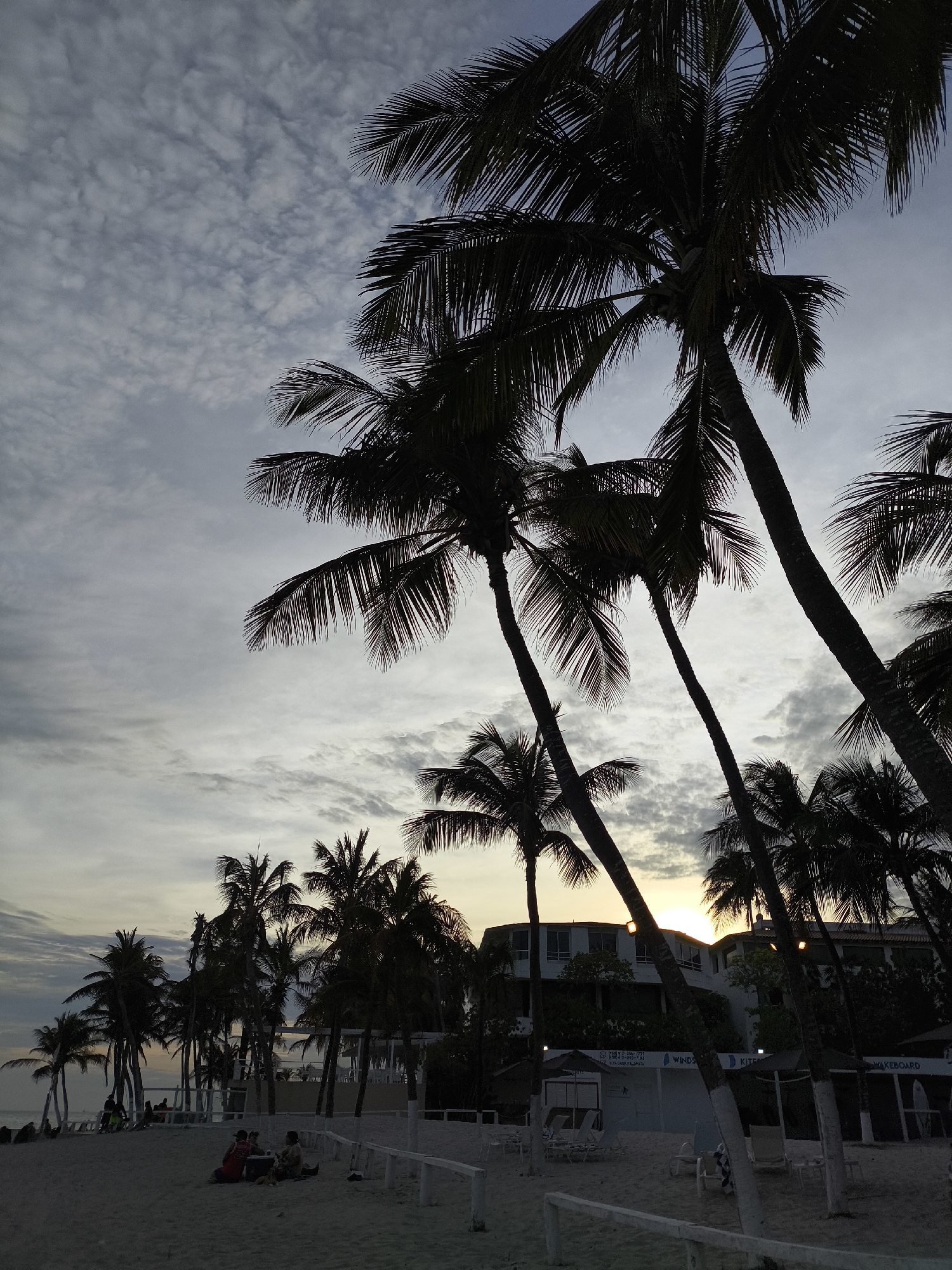 The photograph depicts a beach scene in El Yaque, Venezuela at dusk. Silhouetted palm trees dominate the foreground and midground, framing a view of the sky with soft, greyish-white clouds. The sun is low on the horizon, partially obscured by buildings. In the lower left, several people are sitting on the sand, appearing as dark shapes against the light-colored sand. A low, white fence runs along the edge of the beach. Behind the fence, more palm trees and a low-rise building are visible. The building has a white facade with several windows. A sign that says "WINDSURF" is present. Overall, the image conveys a sense of tranquility and the transition from day to night.