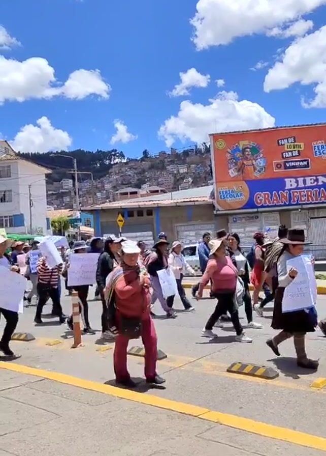 group of people marching on a city street during the day. Most of the people are wearing hats and carrying signs. There are a few police officers among the marchers. The street is paved and has yellow traffic dividers. In the background, there are buildings and a billboard that reads "Gran Feria Escolar." The sky is blue with scattered white clouds.