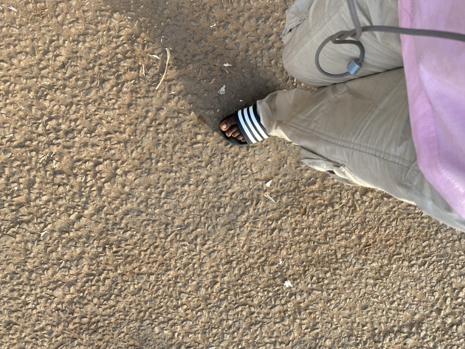 Television, Nigeria: The image presents a high-angle, top-down view of an individual's lower body on a textured ground surface