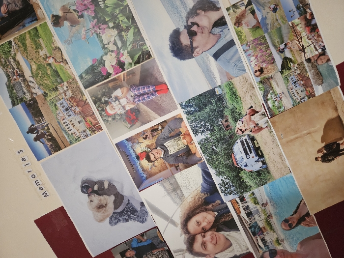 The image displays a wall-mounted collage of approximately 20-25 personal photographs, arranged diagonally and overlapping, on a light-colored surface with a visible deep red section on the left and bottom