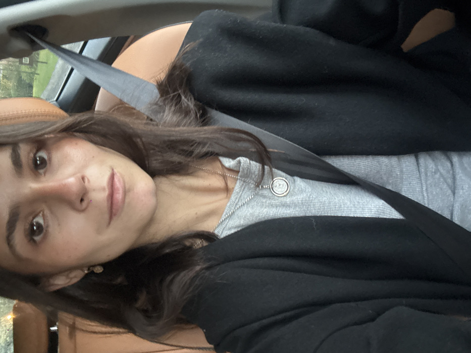 A female subject is depicted seated inside a vehicle. She has long, dark brown hair, fair skin, and brown eyes, looking directly at the camera with a neutral expression. She wears a grey ribbed long-sleeve top underneath an open black coat or jacket. A silver chain necklace with a circular pendant is visible around her neck, along with a small, light-colored earring in her left ear. She is secured by a dark grey seatbelt that crosses diagonally over her chest and shoulder. Behind her, a brown leather car seat headrest and side bolster are visible. Through the vehicle window in the background, a blurred outdoor scene with green foliage and an indistinct light-colored sign or structure is discernible. The scene is located in Mexico City, Mexico.