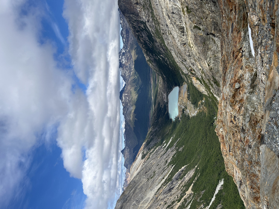 A steep mountain landscape showcases a turquoise lake nestled among green slopes. Jagged, layered rock formations dominate the foreground. Distant peaks fade into the horizon beneath a sky filled with a mix of white and grey clouds, contrasted by patches of blue. The perspective suggests a high vantage point, possibly from another mountain peak.