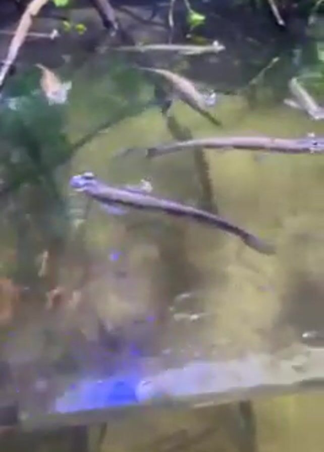 group of elongate, slender, silver fish swimming in an aquarium. The aquarium is decorated with branches, green plants, and a sandy bottom. There is a blue light shining in the water. The fish move mostly in the same direction, staying close to the top of the water. The water is somewhat murky. In the background, there are voices speaking.