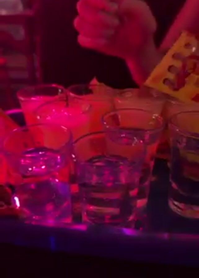 A tray of mixed shot glasses under colored lights is shown. Some of the shots are clear liquid and others are a thick yellow liquid. Someone is adding lime or lemon slices to some of the yellow shots. Music is playing in the background.