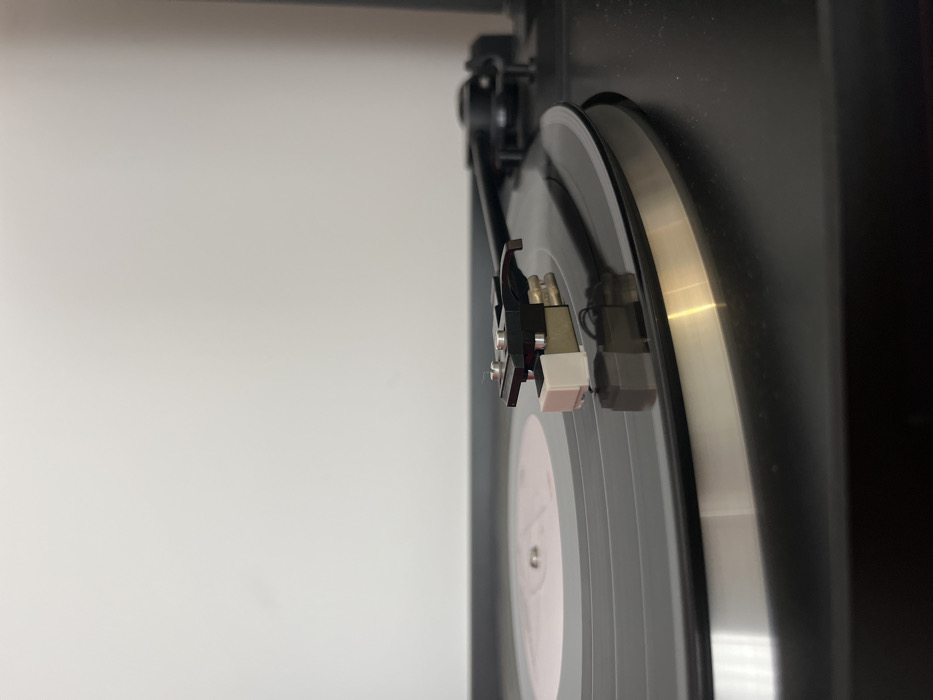 An indoor scene in Bečići, Montenegro, depicts a close-up, angled view of a black turntable. A black vinyl record with visible grooves rests on the turntable's platter, which features a reflective silver-colored edge. A black tonearm extends over the record, with a phono cartridge attached. The cartridge is primarily black, featuring a light beige or off-white stylus housing engaged with the record's surface, indicating playback. The background consists of a plain, uniformly lit, light-colored wall. No individuals are present.
