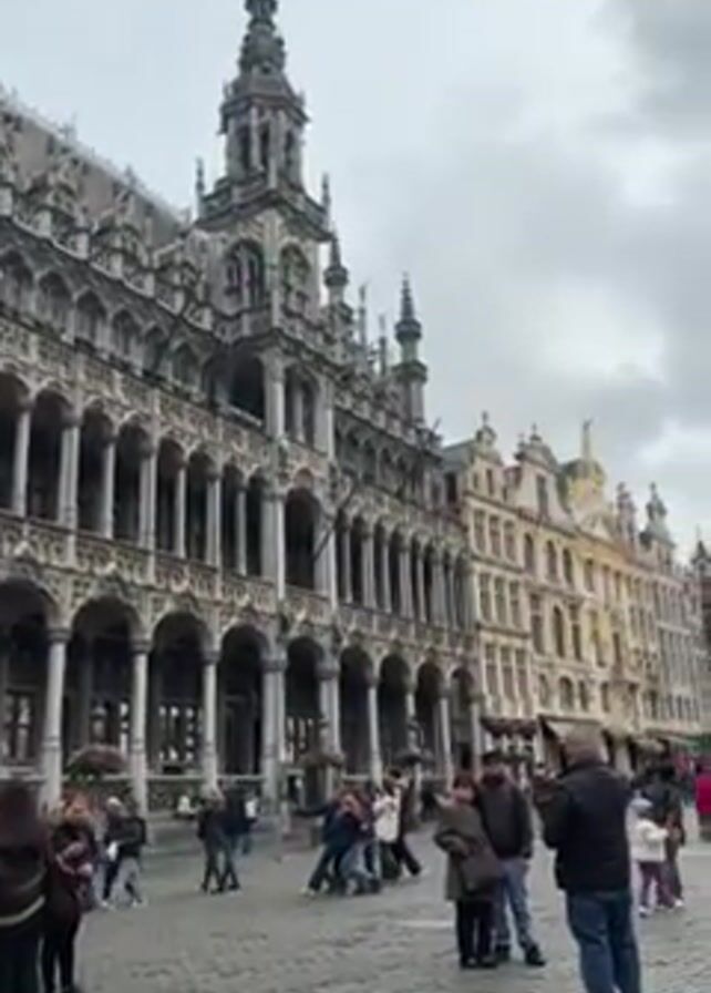 plaza in Brussels, Belgium. It is a cloudy day, and there are many people walking around. The buildings surrounding the square are ornate and appear historic. A man holding a young child is in the foreground of the camera’s view. He is looking at the child.