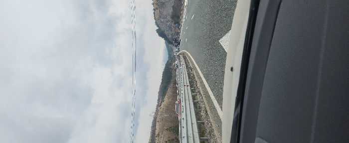 The image depicts a multi-lane asphalt highway viewed from the interior of a vehicle, specifically from its dark grey dashboard and lower windshield
