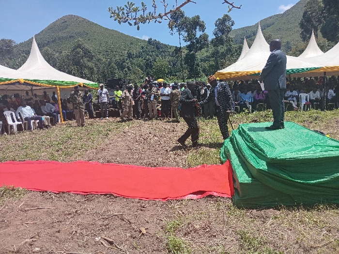 An outdoor public gathering is depicted in Manda-Shivanga ward, Kenya, under clear skies with a distant range of green, forested mountains. In the foreground, a red carpet lies on sparsely vegetated, dry brown earth, leading towards a rectangular platform draped in green fabric. A male individual in a dark suit stands on this green-draped platform, facing away from the camera. To the left of the platform, two men are visible; one in a patterned suit with a cane, and another in a dark suit. A group of approximately ten individuals, some in uniforms resembling security attire, stand near the platform. Further back, several white canopy tents with yellow and green trim are erected. Beneath these tents, a crowd of approximately 50-70 individuals, primarily men, are seated on white plastic chairs, facing the platform. Additional people are standing around the perimeter of the tents. The ground consists of dry soil with scattered patches of green vegetation. Overhead, a few tree branches are visible against the blue sky. The scene is brightly illuminated by daylight.