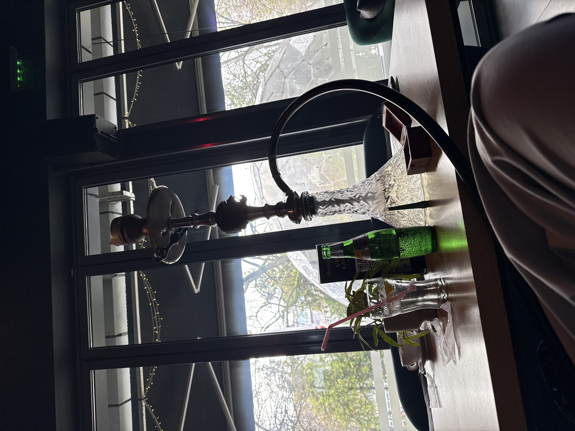 A hookah sits on a table next to a drink with a straw, a green bottle, and a menu. The scene is indoors, near a window with a view of a cityscape, possibly in Plovdiv, Bulgaria, judging by the architectural style visible through the window. The table is partially occupied by a person whose body is partially visible.