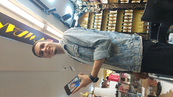 The image depicts an indoor scene within a retail establishment, located in Barza Municipality, Syria. A young male, light-skinned, with short dark hair and light facial stubble, stands slightly angled to the left, smiling directly at the viewer. He wears a light blue denim jacket over a white t-shirt and dark trousers, with a black smartwatch on his left wrist. His left hand holds a black smartphone horizontally, displaying an image of a young child with red hair and blue eyes, also smiling. The background shows a commercial setting, likely a perfumery. To the subject's right, a dark, ornate shelving unit with gold accents displays multiple rows of products: transparent bottles with golden caps on upper shelves, and numerous golden cylindrical spray cans/bottles with Arabic text on middle shelves. Below these are decorative clear glass bottles. Above the shelving unit, a black sign with yellow/gold Arabic text, partially visible, reads "COMPA" or a similar phrase. Overhead, ceiling lights, including recessed spotlights and a linear light strip, illuminate the area. A white dome-shaped security camera is mounted on the ceiling in the mid-background. To the subject's left, a counter with various items, including a white dispenser and a red box, is visible, partially obscuring another person with light hair. A black chair with a high back is partially visible in the bottom right corner.