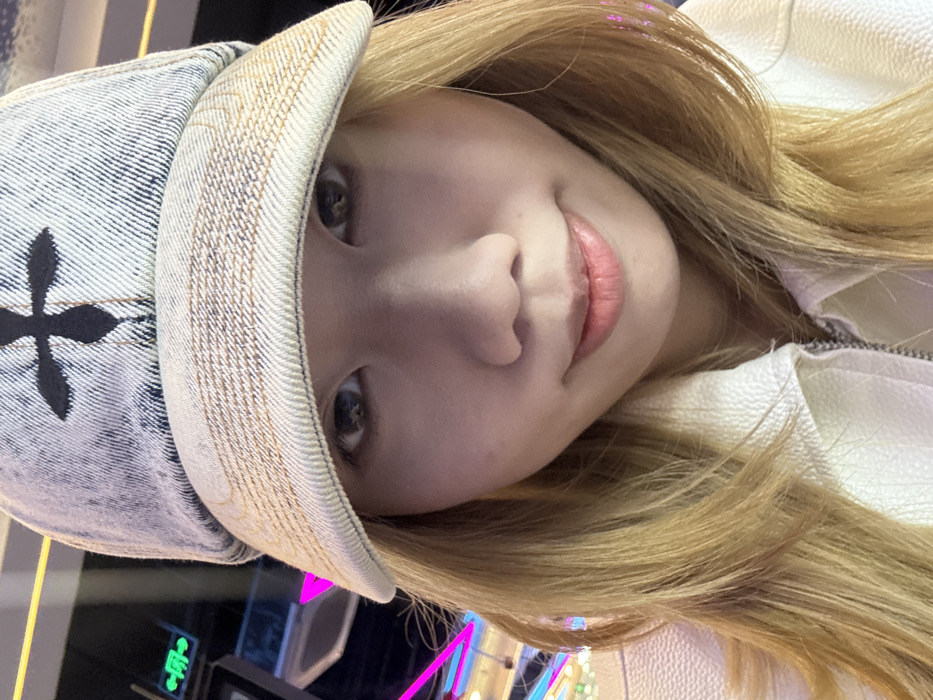 A close-up, eye-level selfie depicts a young East Asian female looking directly into the camera with a subtle, closed-lip smile. She wears a light-wash denim baseball cap with a dark, stylized cross emblem on the crown and intricate golden stitching on the brim, pulled low over her forehead. Her long, light brown hair frames her face, and she is wearing a textured, light-colored jacket or shirt with a visible zipper pull at the collar. The background is out of focus but shows various neon or LED lights in pink, blue, and green, suggesting an indoor commercial or entertainment venue. A green illuminated exit sign, consistent with Chinese signage, is partially visible in the upper left, indicating the scene is located within Jiulongpo District, China.