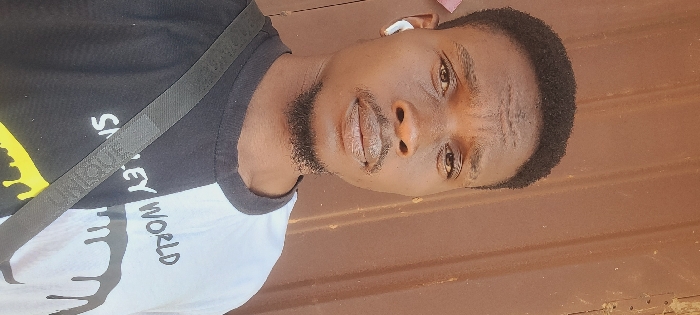 A male individual with dark skin, short curly hair, a trimmed beard, and mustache is depicted in a chest-up portrait. He wears a white wireless earbud in his left ear. His expression is neutral as he looks directly into the camera. He is wearing a two-tone t-shirt, vertically split with the left side black and the right side white. The black section features the text "SMILEY WORLD" in white above a yellow dripping graphic. The white section displays a black dripping graphic. A dark strap, possibly from a bag, extends diagonally across his chest from his left shoulder. The background is a solid, out-of-focus light brown or tan surface, potentially corrugated metal. The scene is located in Badiko, Nigeria.