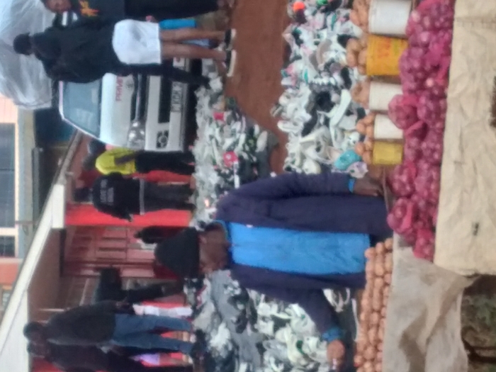A crowded street scene shows people near a market stall displaying onions and other items. A man in a blue jacket and black hat stands near the stall. In the background, individuals are visible walking near a white van. A pile of assorted items, possibly clothing or shoes, lies on the ground. Buildings are seen in the distance.