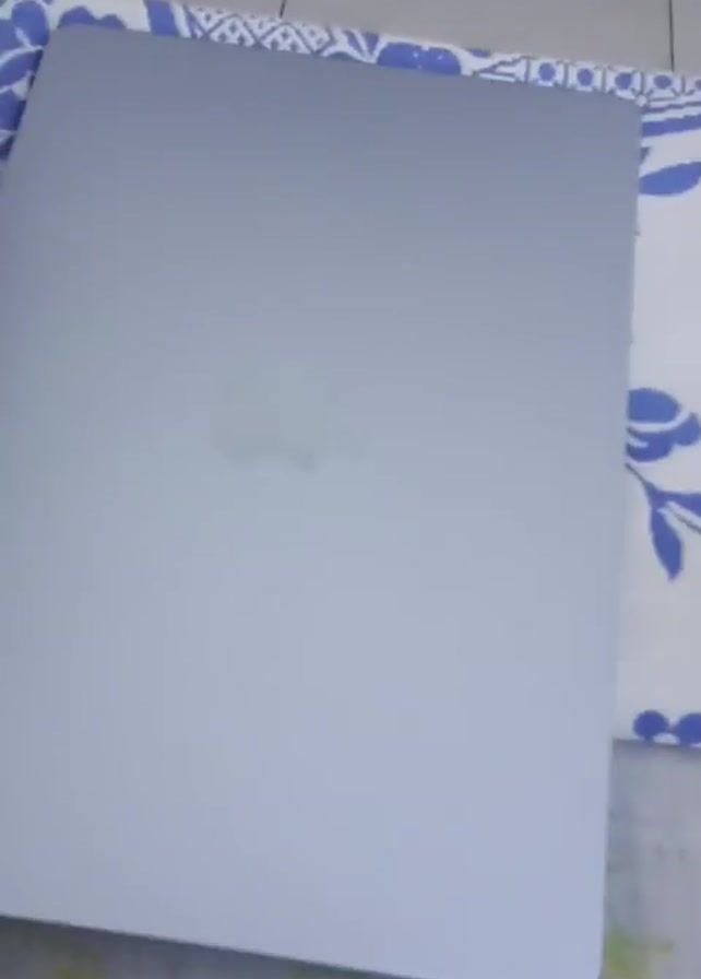closed, silver Apple laptop on a surface covered with a patterned cloth. The camera zooms in on the Apple logo on the laptop lid. The footage is slightly blurry.