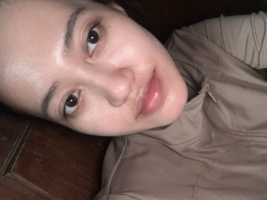 A close-up, high-angle portrait shot depicts a female individual, likely in Gadingrejo, Indonesia. She is positioned diagonally, facing the camera with a neutral expression. Her skin appears fair with some shine, and she has dark eyes, defined eyebrows, and full, slightly parted lips. Minor dark circles are visible beneath her eyes. She wears a light brown or tan zip-up jacket with visible seams and a collar; a zipper pull is present, and faint text, possibly "KIE," is discernible on the right side of the garment. A dark, possibly wooden, surface occupies the background. Lighting is dim and appears to come from the front.