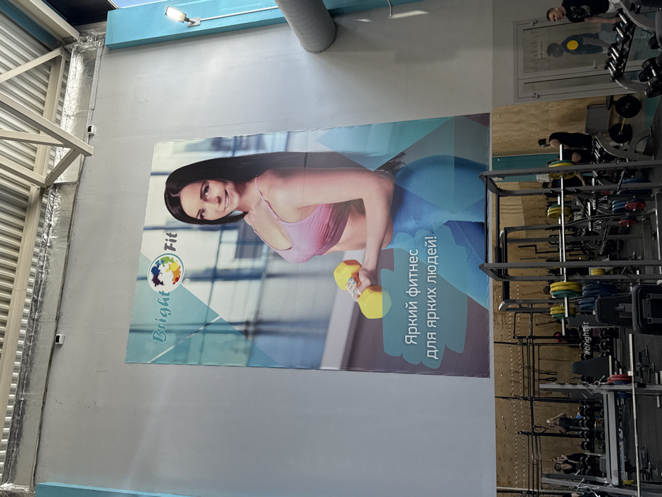 The image depicts the interior of a "Bright Fit" fitness club located in Yekaterinburg, Russia