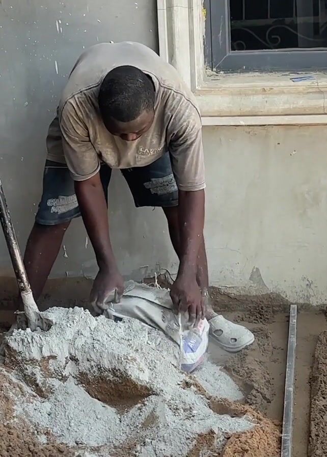 A man is working outside of a building. He is wearing a beige t-shirt, black shorts, and white shoes. He is holding a large white bag with red and purple markings, pouring it onto a pile of gray powder and dirt. To his left is a black shovel leaning against the building. To his right is a box of tiles. There is a window behind him. The building is light gray. The sky is visible in the background.