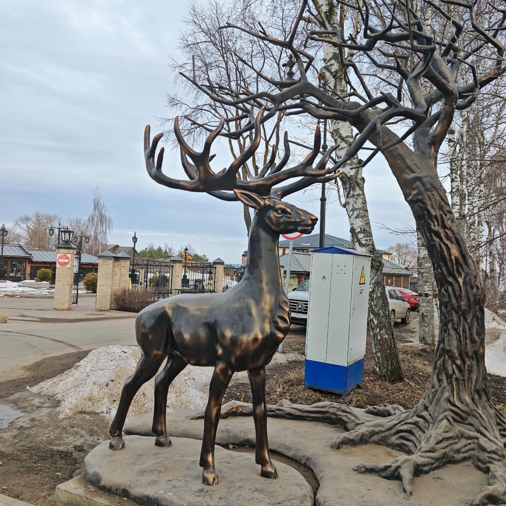 The image displays an outdoor scene in Novo-Nikol'skoe, Russia, under an overcast sky. In the foreground, a large, bronze-colored statue of a male deer with elaborate antlers stands facing right on a textured grey concrete base. To its immediate right, a dark, gnarled sculpture of a bare tree with twisted branches and roots, also appearing to be cast in bronze, emerges from the same concrete base. Behind these sculptures, several natural birch trees with characteristic white and black bark and bare branches are present. A white utility cabinet with a blue base and a yellow triangular hazard symbol is situated behind the deer statue. To the left, a paved asphalt road or pathway is partially covered by melting, dirty snow and exposed damp soil. In the mid-ground, an ornate entrance features two light-colored brick pillars topped with black decorative lampposts, supporting a black wrought-iron gate. A circular red "No Entry" sign is affixed to the left pillar. Beyond this gate, a complex of low-rise buildings with grey sloped roofs is visible. A white Mercedes-Benz sedan with Russian license plate Y131PA797 is partially visible behind the deer statue. Further in the background, other vehicles, including a white SUV and a red car, are parked amongst bare trees. An indistinct person in dark clothing is visible walking behind the gate on the right side of the image. The ground consists of patches of melting snow, wet earth, and sparse dry foliage.