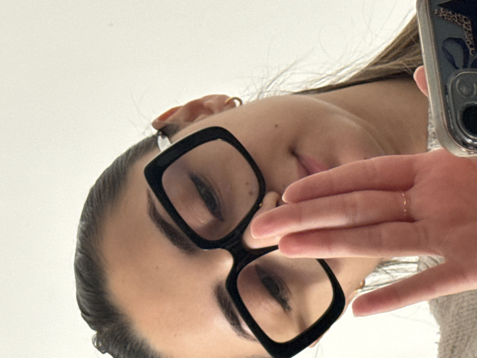 The image displays a close-up, low-angle shot of an adult female, positioned in an indoor setting in Limeil-Brévannes, France. The subject wears large, square-framed black eyeglasses. Her dark hair is pulled back, and small gold-colored hoop earrings are visible on both ears. Her gaze is directed downwards. A faint smile is perceptible on her lips. Her right hand is raised, palm partially facing the camera, covering the lower portion of her face from the nose down. A thin, gold-colored ring with a subtle textured design is present on the ring finger of her right hand. The lower right corner of the frame reveals the top portion of a smartphone, held by the subject's left hand. The phone is encased in a transparent cover revealing a leopard print pattern beneath, and its multi-lens camera module is visible. The subject wears a light-colored, possibly knitted, garment. The background is a plain, undifferentiated light-colored surface.