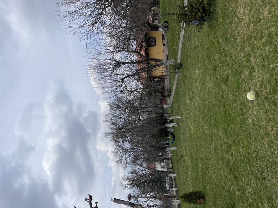 This image captures an outdoor residential property under an overcast sky in Boboratsi, Bulgaria. The foreground consists of a well-maintained green lawn, featuring a single, worn yellow-green tennis ball resting near the lower-center. A small, conical evergreen shrub is situated on the lower-left, and a larger evergreen tree with an attached dark, rectangular solar device stands on the lower-right. A light-colored pathway meanders through the midground, leading towards a single-story house in the upper-right. This house has yellow walls and an orange-tiled roof. Scattered throughout the midground are numerous bare-branched deciduous trees, many with their trunks painted white. A blue and black fabric hammock is suspended between two of these white-trunked trees on the left side of the midground. In the background, a white fence line is visible, behind which a gray sedan is parked on what appears to be a street. A utility pole with a light fixture extends into the frame from the far left. An antique wooden wagon wheel is positioned decoratively near the yellow house. No individuals are present in the scene.