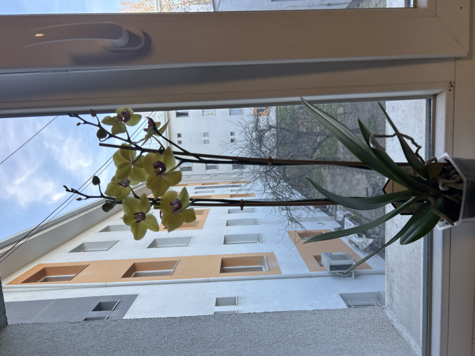 The image presents an interior view looking out through a white-framed window onto a residential area in Plovdiv, Bulgaria. Centered on the white windowsill is a blooming Phalaenopsis orchid plant. The orchid displays two primary flower spikes, supported by slender brown stakes, featuring multiple open yellow flowers with distinct purple-magenta centers, along with several undeveloped buds. The plant has several dark green leaves and visible aerial roots, contained within a clear, possibly hexagonal, plastic pot. A small, light-colored tag is partially visible near the plant's base. Beyond the window, under a partly cloudy blue sky, multiple multi-story apartment buildings are visible. The building immediately to the left features a white facade with vertical orange sections and numerous rectangular windows with white frames. An external air conditioning unit is mounted on a lower portion of this building. Further into the background, additional white-colored residential structures are present. A deciduous tree with bare branches, indicative of winter or early spring, stands in the midground between the buildings. The ground directly beneath the tree appears barren. A white window handle is partially visible on the right vertical frame of the interior window. No individuals or specific activities are observable within the depicted scene.