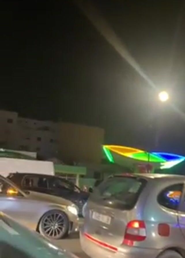 traffic jam at night. The camera is inside a car, looking out the windshield and side windows. A silver Mercedes-Benz sedan is to the left, and behind that, a white van. A Renault Scenic is to the right. In the background, an elevated structure with a roof lit up in blue, green, yellow, and orange. The camera car moves forward slightly, and the camera briefly points down at the dashboard, before pointing back up at the Mercedes-Benz sedan and the child looking out the window. Horns can be heard blaring.