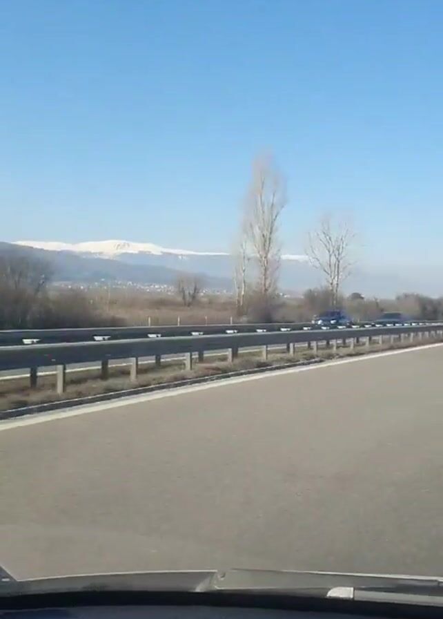 car driving down a highway on a sunny day. The road has two lanes on each side, separated by a median. Other vehicles are visible on the road. In the background, there are fields, trees, and mountains capped with snow. Billboards for KFC and KRESTON BULMAR are visible. The camera is mounted inside the car, capturing the view from the driver's perspective.