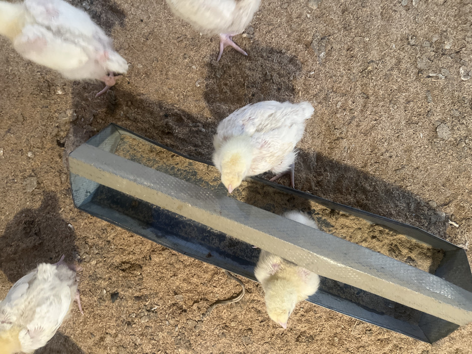 - "Several small, fluffy, white chicks are shown near a metal feeder filled with granular feed on a surface covered with wood shavings" by FM-TTikC3, licensed under CC BY 4.0