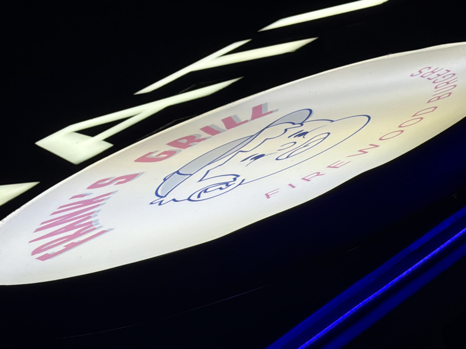 brightly lit, circular sign with a white background, featuring a cartoonish character outlined in blue. Above the character, the words "CHUNK'S GRILL" are written in pink. Below, "FIREWOOD BURGERS" is also in pink, curved around the edge of the sign. The sign appears to be illuminated from behind, set against a black background with a faint, stylized white shape above it and a blue element underneath.