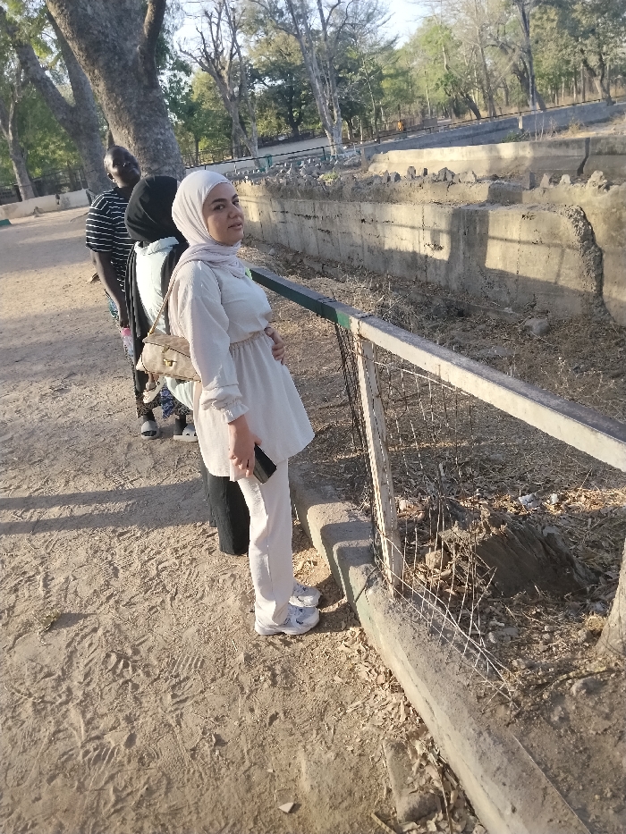 In Garun Gawa, Nigeria, three individuals are positioned on a packed dirt path alongside a metal wire fence. The primary subject, a female, stands in the foreground, wearing a light beige hijab, a long-sleeved light beige tunic with an elasticated waist, and matching light beige trousers paired with white athletic shoes. She holds a black smartphone in her right hand and carries a light brown shoulder bag, looking slightly left of the frame. Behind her, a male individual in a black and white striped shirt and another person in a light blue top with a dark head covering are partially obscured. The metal fence, comprising horizontal bars, vertical posts, and wire mesh, separates the path from a lower, dry concrete enclosure. This enclosure features tiered concrete walls, some showing degradation, and a base covered with dry leaves, dirt, and debris. Large trees with visible trunks and sparse foliage are present in the background, under bright sunlight, which casts distinct shadows across the dirt ground.