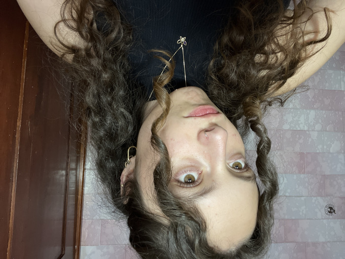 A woman with long, curly brown hair and green eyes stares directly at the viewer. She wears a black top and minimal makeup, with a subtle lip tint. A long, delicate gold earring with a floral design hangs from her chest. Her face is partially framed by two spiraled strands of hair. The background consists of a wooden door on one side and pink-toned tiled walls on the other. The image is rotated, giving an upside-down perspective.